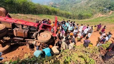 നിറയെ ലോഡ്, ചെങ്കല്ലുമായി വന്ന ലോറി കുത്തനെയുള്ള ഇറക്കത്തിൽ മറിഞ്ഞു, ഡ്രൈവര്ക്കും സഹായിക്കും പരിക്ക്