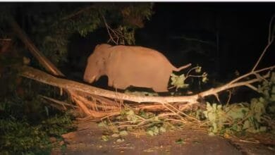 മരവും പനയും റോഡിലേയ്ക്ക് മറിച്ചിട്ട് കബാലി; നടുറോഡിൽ നിലയുറപ്പിച്ചത് മണിക്കൂറുകൾ, ഗതാഗതം തടസപ്പെട്ടു
