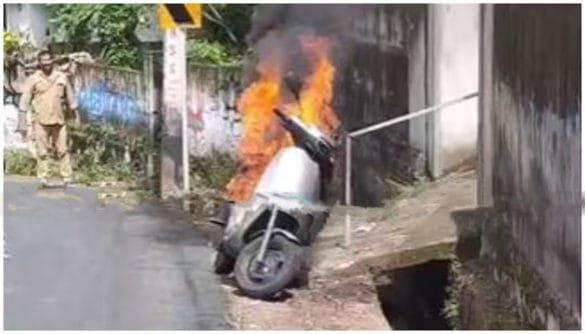 ഓടിക്കൊണ്ടിരിക്കെ ഇലക്ട്രിക് സ്കൂട്ടറിന് തീപിടിച്ചു, നിമിഷനേരത്തിൽ തീ പടർന്നു പിടിച്ചു; വിദ്യാർത്ഥിക്ക് രക്ഷ