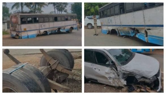 എതിർദിശയിൽ നിന്നും കാർ വന്നിടിച്ചു, കെഎസ്ആർടിസി ബസിന്റെ ടയറുകൾ ആക്സിലടക്കം ഇളകിമാറി; അപകടം കൊല്ലത്ത്