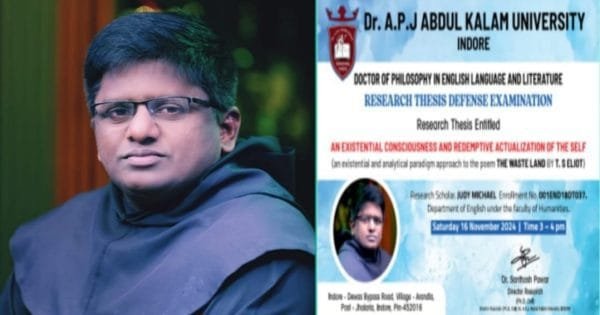 കൊച്ചി: മഞ്ഞുമ്മൽ കർമലീത്ത പ്രൊവിൻസ് അംഗമായ ഫാ.ജൂഡി മൈക്കിൾ ഒ സി ഡിക്ക് ഇംഗ്ലീഷ് സാഹിത്യത്തിൽ ഡോക്ടറേറ്റ് ലഭിച്ചു.ഇൻഡോറിലെ ഡോ.എപിജെ അബ്ദുൽ കലാം സർവ്വകലാശാലയിൽ നിന്നുമാണ് ഇദ്ദേഹം ബഹുമതി കരസ്ഥമാക്കിയിരിക്കുന്നത്. ലോകം ആദരിക്കുന്ന ആംഗലേയ സാഹിത്യകാരനായ ടി എസ് എലിയറ്റിന്റെ വിശ്വപ്രസിദ്ധമായ ‘ദ വേസ്റ്റ് ലാൻഡ്’ എന്ന ഇതിഹാസ കവിതയെക്കുറിച്ചുള്ള പഠനത്തിനാണ് ഫാ.ജൂഡി മൈക്കിൾ ഒ സി ഡിക്ക് ഡോക്ടറേറ്റ് ലഭിച്ചത്. ഒരു നൂറ്റാണ്ടിന്റെ തന്നെ പ്രതീകമായ വേസ്റ്റ് ലാൻഡ് എന്ന കവിതയിലെ തത്ത്വശാസ്ത്രം, ദൈവശാസ്ത്രം, മനശാസ്ത്രം എന്നിവയെല്ലാം ആഴത്തിൽ പരിശോധിക്കുകയും മനുഷ്യകുലത്തിന്റെ അസ്തിത്വം ദൈവികമായും താത്വികമായും എപ്രകാരം നിലനിർത്താം എന്നും ഈ പ്രബന്ധത്തിൽ പ്രതിപാദിക്കുന്നുണ്ട്.