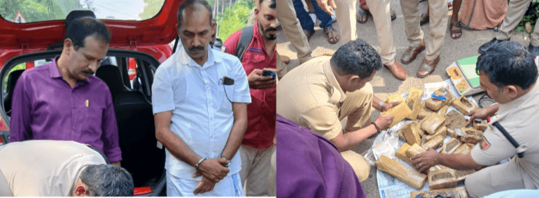 ഇരിട്ടി : കര്ണാടകയില് നിന്നും കേരളത്തിലേക്ക് കടത്തുന്നതിനിടെയാണ് 4 കിലോ കഞ്ചാവുമായി മുൻ ശിവപുരം സ്വദേശിയും ഇപ്പോൾ കുടിക്കിമൊട്ടയിൽ താമസകാരനുമായ നെസീറിനെ കുന്നോത്ത് ബെന്ഹിലില് വച്ച് എക്സൈസ് സംഘം പിടികൂടിയത്.തുടര്ന്ന് കാറില് നടത്തിയ പരിശോധനക്കിടെയാണ് വിവിധ ഭാഗങ്ങളില് ഒളിപ്പിച്ച നിലയില് 10 കിലോയോളം കഞ്ചാവ് കണ്ടെത്തിയത്.
