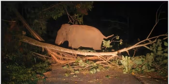 മരവും പനയും റോഡിലേയ്ക്ക് മറിച്ചിട്ട് കബാലി; നടുറോഡിൽ നിലയുറപ്പിച്ചത് മണിക്കൂറുകൾ, ഗതാഗതം തടസപ്പെട്ടു