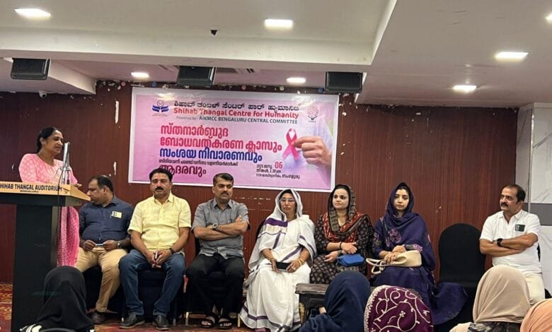 ബാംഗ്ലൂർ: സമൂഹത്തിൽ വ്യാപകമായി വരുന്ന സ്തനാർബുദം നേരത്തെ തിരിച്ചറിയുന്നതിലൂടെ പൂർണമായും ചികിത്സിച്ച് ഭേദമാക്കാൻ കഴിയുമെന്നിരിക്കെ തിരിച്ചറിയുന്നതിലും ചികിത്സ തേടുന്നതിലുമുള്ള കാലതാമസമാണ് ഇന്ന് കാണുന്ന രീതിയിൽ ഇതിൻ്റെ പാർശ്വ ഫലങ്ങൾ വർധിപ്പിക്കുന്നതെന്ന് പ്രമുഖ കാൻസർ രോഗ വിദദ്ധ ഡോ പി വി അനീന പറഞ്ഞു. കഴിഞ്ഞ കാലങ്ങളിൽ 60 വയസിന് മുകളിൽ പ്രായമുള്ള സ്ത്രീകളിലായിരുന്നു ഇത് കൂടുതൽ കണ്ടിരുന്നതെങ്കിൽ ഇന്നത് 30 വയസിന് മുകളിലുള്ളവരിൽ പോലും വലിയ തോതിൽ കണ്ട് വരുന്നു. സ്വയം പരിശോധനയിലൂടെ തന്നെ ഏറെക്കുറെ തിരിച്ചറിയാൻ കഴിയുന്ന ഒരു രോഗം സാമൂഹിക ബോധവൽക്കരണത്തിൻ്റെ അപര്യാപ്തത കൊണ്ട് മാത്രമാണ് ഇത്രയും വ്യാപകമാവുന്നത്. സ്തനങ്ങളിൽ ഉണ്ടാവുന്ന വേദനയില്ലാത്ത തടിപ്പുകൾക്ക് എത്രയും വേഗം പരിശോധനയിലൂടെ കൃത്യത വരുത്തുന്നതിൻ്റെ പ്രാധാന്യവും ഇത് തന്നെയാണ്. ഡോ അനീന പറഞ്ഞു. എഐകെഎംസിസി ശിഹാബ് തങ്ങൾ സെന്റർ ഫോർ ഹ്യുമാനിറ്റി സംഘടിപ്പിച്ച സ്തനാർബുദബോധവൽക്കരണ  ക്ലാസിൽ മുഖ്യപ്രഭാഷണം നടത്തുകയായിരുന്നു അവർ. പ്രസിഡന്റ് ടി ഉസ്മാൻ അധ്യക്ഷത വഹിച്ചു. ജ.സെക്രട്ടറി എംകെ നൗഷാദ് സ്വാഗതം പറഞ്ഞു. വനിതാ ലീഗ് ദേശീയ സെക്രട്ടറി ജയന്തി രാജൻ ഉദ്ഘാടനം ചെയ്തു. ഡോ. മൂന മുഹമ്മദ് വിദ്യാത്ഥികളുടെ സ്വഭാവ രൂപീകരണത്തിലെ  അമ്മമാരുടെ പങ്കിനെ അവതരിപ്പിച്ചു. എസ്ടിസിഎച്ച് പാലിയേറ്റീവ് കെയർ ഡയറക്ടർ ഡോ അമീറലി ആമുഖ ഭാഷണം നടത്തി.  മുനീർ ടിസി മുനീർ നന്ദി പറഞ്ഞു.