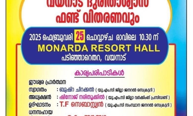 യു എം സി കണ്ണൂർ ജില്ലാ കമ്മിറ്റിയുടെ നേതൃത്വത്തിൽ ജില്ലാ ലീഡർഷിപ്പ് കാമ്പയിനും വയനാട് ദുരിതാശ്വാസ ഫണ്ട് വിതരണവും നടക്കും