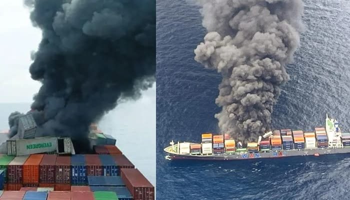 കത്തിയമരുന്ന കപ്പലിനുള്ളിൽ ആസിഡുകളും ഗൺപൌഡറും ലിഥിയം ബാറ്ററികളും, 154 കണ്ടെയ്നറുകളിൽ അപകടരമായ വസ്തുക്കൾ