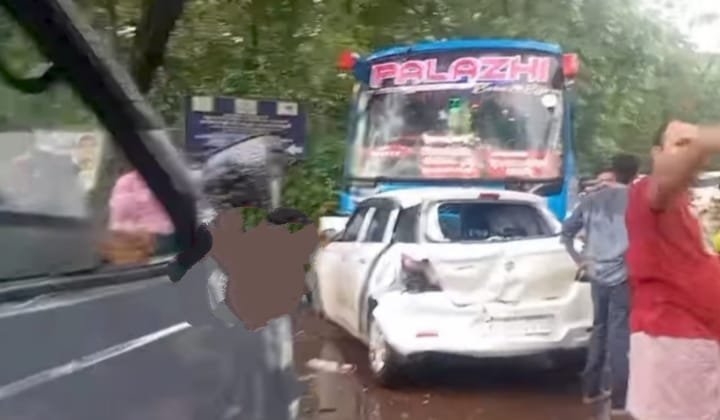പിക്കപ്പിനെ മറികടുക്കുന്നതിനിടെ കാർ ബസ്സിൽ ഇടിക്കുകയായിരുന്നു.ഇടിയുടെ ആഘാതത്തിൽ കാറിന്റെ മുൻ ഭാഗം പൂർണ്ണമായും തകരുകയായിരുന്നു.അപകടത്തിൽ പിന്നോട്ട് നീങ്ങിയ കാർ പിക്കപ്പ് വാനിൽ ഇടിച്ച് പിക്കപ്പ് വാനിനും തകരാർ സംഭവിച്ചിട്ടുണ്ട്. കാറിലുണ്ടായിരുന്നവർ നിസ്സാര പരിക്കുകളോടെ രക്ഷപെട്ടു.