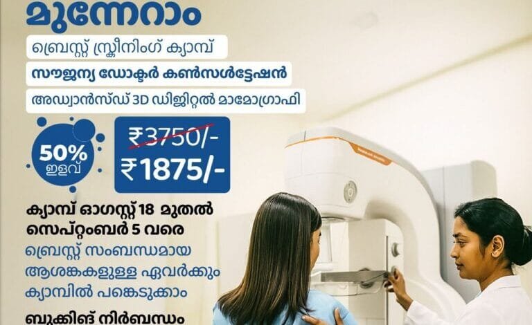 വനിത ഡോക്ടര്മാരുടെ നേതൃത്വത്തിലാണ് ക്യാമ്പ് നടക്കുന്നത്. വനിതാ റേഡിയോളജിസ്റ് ഡോ തുഷാരയുടെ നേതൃത്വത്തിലുള്ള മാമ്മോഗ്രാം പരിശോധനയ്ക്ക് പുറമെ വനിതാസര്ജന് ഡോ.ശ്വേത സുരേഷ് ,വനിതാ ഓങ്കോളജിസ്റ്റ് ഡോ. ഗോപിക തുടങ്ങിയവരുടെ സേവനവും ക്യാമ്പില് ലഭ്യമാകും. ക്യാമ്പില് രജിസ്റ്റര് ചെയ്യുന്നതിന് 6235000513 എന്ന നമ്പറില് ബന്ധപ്പെടുക.